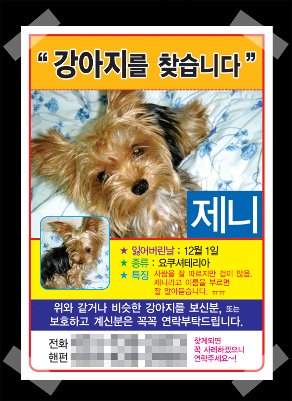 여러분도 혹시.. 기르던 애완견이 실종되면 바로 전단 만들어서 뿌리세요^^