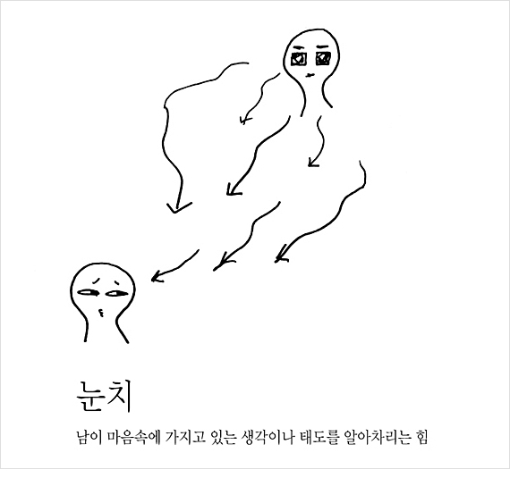 높은 사람의 눈치를 보면서 정시퇴근을 하지 못하는 날들이 지속되면서, 조금이라도 일찍 나가기 위해 디자이너들은 눈치가 발달된다. 눈치는 ‘남이 마음 속에 가지고 있는 생각이나 태도를 알아차리는 힘’이다. 디자이너의 상상은 ‘나’의 안에서 이루어진다. 남의 마음을 읽고 있으면 상상은 생산될 수 없다. 눈치는 약삭빠른 사람을 만들어내고, 상상은 사람을 움직이는 정보를 만들어낸다.