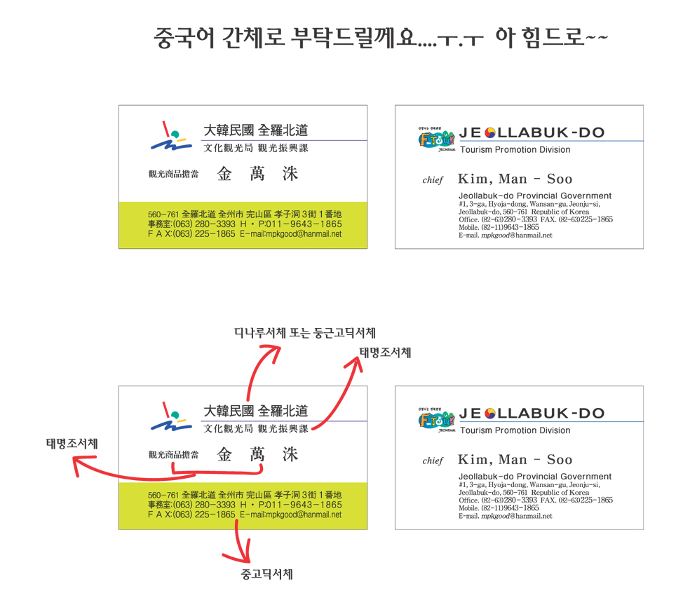 중국어 간체로 명함글씨 아웃라인 부탁드려요...ㅜ.ㅜ 혀리 일반 0 7510 2007.02.06 19:47 -0001.11.30 00:00 jj.ai (0byte) + 34 아무리 방법을 모색해도 할수가 없네요... 오늘 인쇄해야하는데..ㅜ.ㅜ 염치불구하고 올려봅니다...부탁드릴께요...ㅜ.ㅜ
